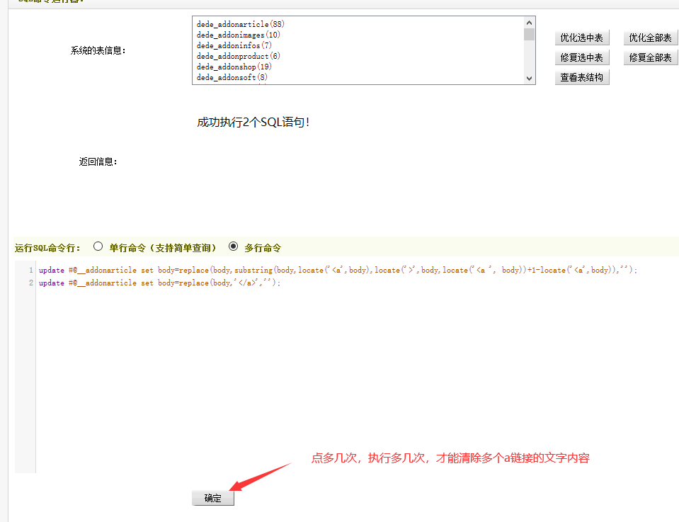 update dede_addonarticle set body=replace(body,substring(body,locate('<a',body),locate('>',body,locate('<a ', body))+1-locate('<a',body)),'');update dede_addonarticle set body=replace(body,'</a>','');