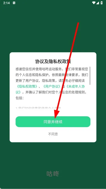 1、打開咕咚,在彈窗中點擊同意并繼續。