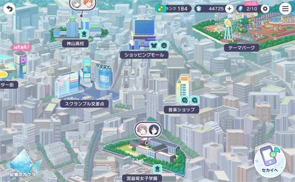 3、地圖,點右上角的球即可進入地圖,這是現實世界的地圖,其中“宮益坂女子學園”和“神山高校”是買花的地方(30級解鎖)提升綜合力,“音樂和シヨツプ”是買歌和買翻唱的地方、“シヨツピンブル”是買服裝和表情包的地方。左下角是進入到過去的時間,右下角是進入虛擬世界,可以選擇5個團各自的世界,可以買家具提升綜合力。