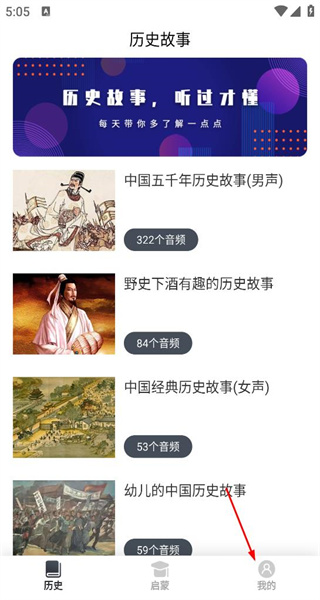 打開軟件主界面后,能看到多款歷史故事音頻分類展示,每個(gè)分類旁邊都標(biāo)注了對(duì)應(yīng)的音頻數(shù)量,界面底部還設(shè)有“歷史啟蒙”“我的”等功能選項(xiàng)。