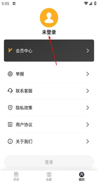 2、點(diǎn)擊我的進(jìn)入個(gè)人頁(yè)面,頁(yè)面顯示未登錄狀態(tài),設(shè)有會(huì)員中心舉報(bào)聯(lián)系客服等功能,上方有對(duì)應(yīng)的狀態(tài)標(biāo)識(shí)。