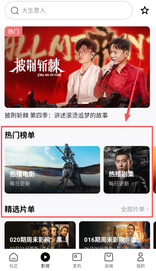 2、探索影視內容:主攻“影視”版塊,它為你整理了熱播電影和精選片單,內容天天更新,是你發現和觀看熱門節目的主要窗口。
