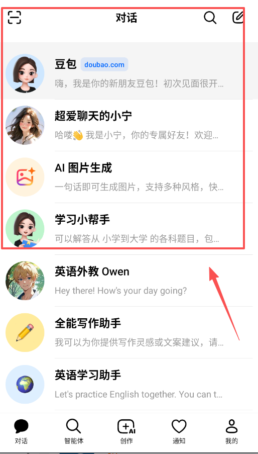 首頁的布局設(shè)計(jì)十分直觀清晰,豆包與小寧作為主要的聊天對(duì)象展示在顯眼位置,向下滑動(dòng)頁面還能看到英語外教Owen、全能寫作助手等各類專項(xiàng)服務(wù)功能。