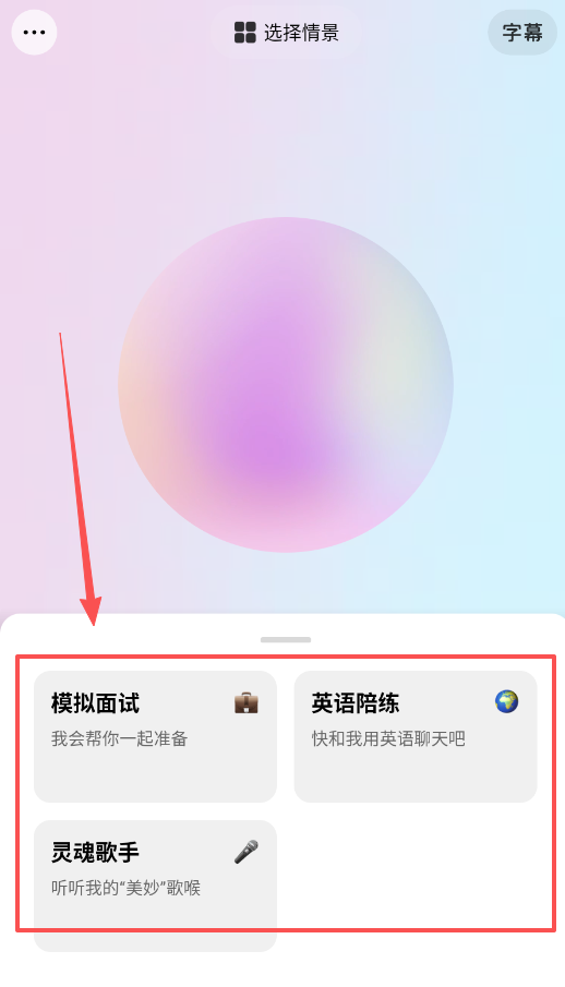 4、情景選擇在功能列表,模擬面試幫你準(zhǔn)備求職問答,英語陪練創(chuàng)造對(duì)話環(huán)境,靈魂歌手提供娛樂互動(dòng)。