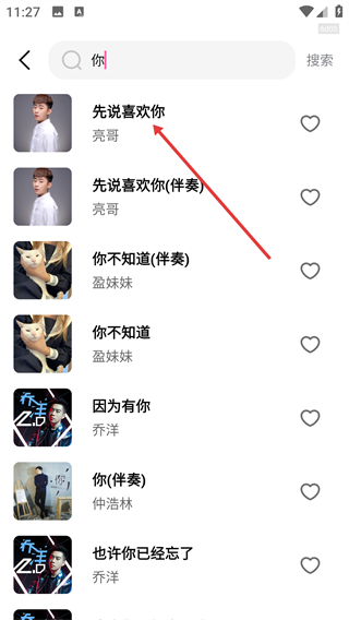 3、在搜索結(jié)果中選擇目標(biāo)歌曲(如【先說(shuō)喜歡你】),點(diǎn)擊進(jìn)入該歌曲的播放界面。