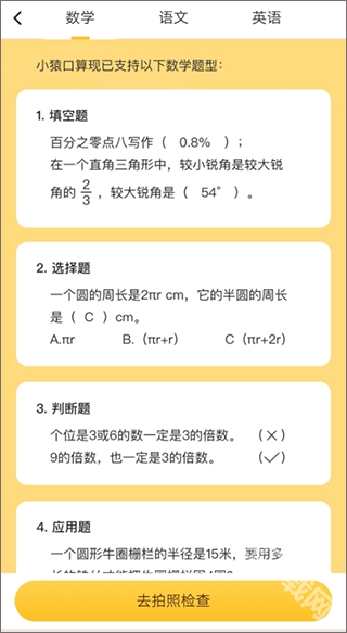 2、多種題型,準確校正:支持口頭算術、垂直計算、單位換算、選擇題、判斷題、單詞題、填空題等題型的檢查,準確率高;