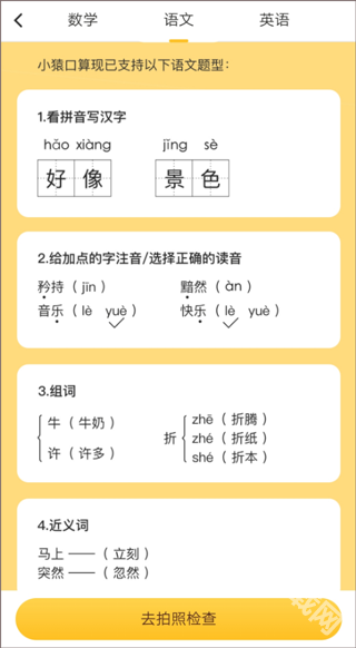 1. 批改速度行業領先,只需要給作業拍張照片,并在1秒內判斷是否正確。它涵蓋了100多種數學題型,還可以糾正中文的書寫錯誤和語法錯誤,大大提高了作業檢查的效率。
