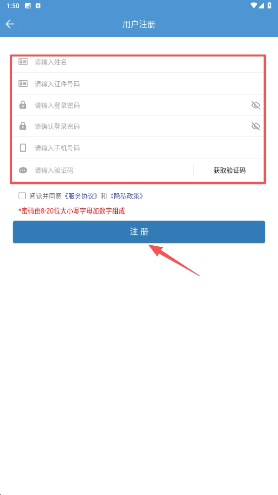用戶注冊的操作流程為:在注冊頁面依次填寫姓名、證件號碼和登錄密碼,勾選相關協議后點擊注冊按鈕,即可完成注冊。