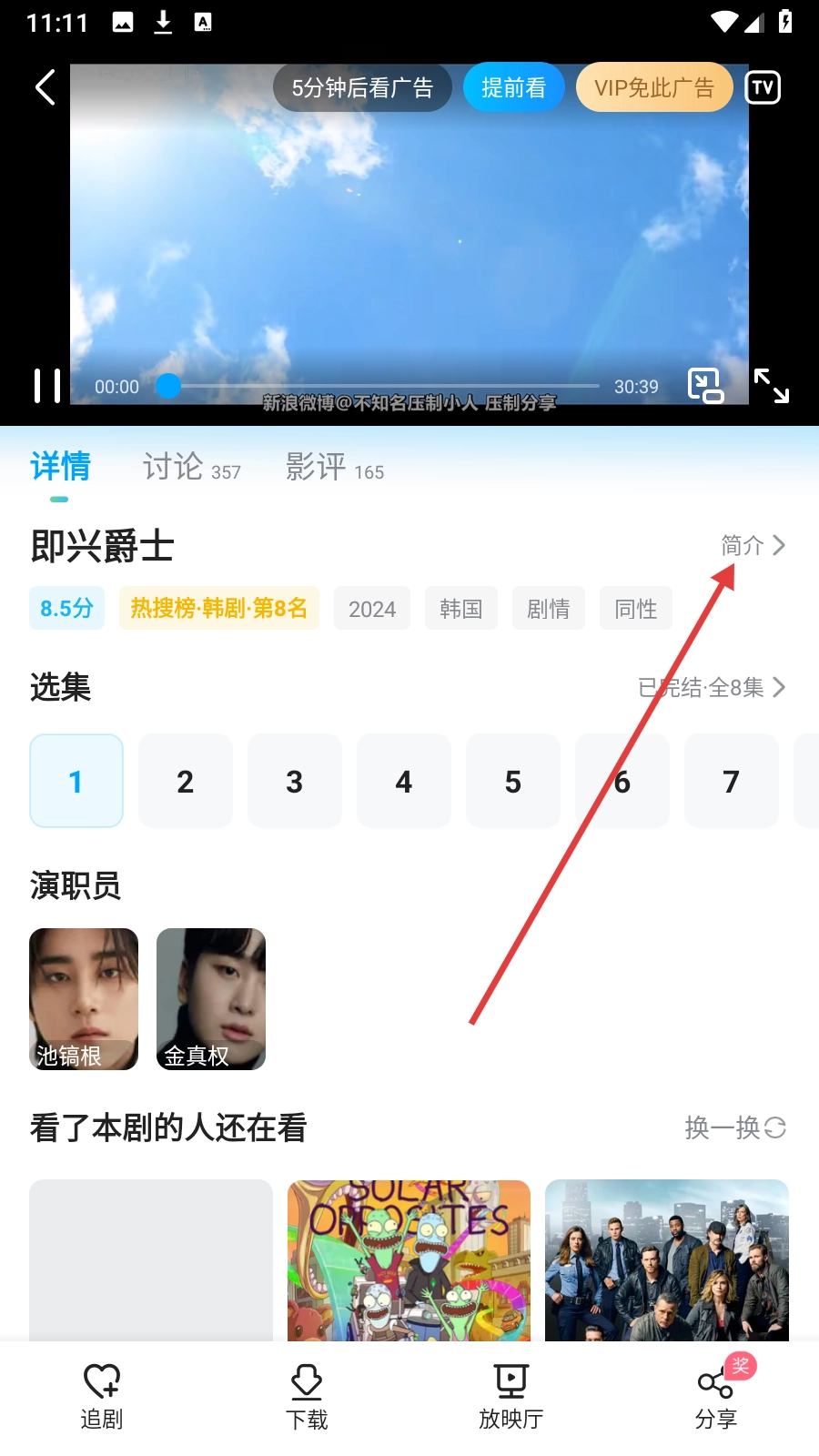 想要了解集數(shù)、評分以及熱搜排名的信息,可以在詳情頁查看,點擊【簡介】即可。