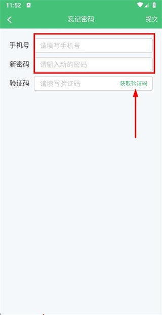在忘記密碼頁面填寫手機號和新密碼后,點擊“獲取驗證碼”按鈕來獲取驗證碼。
