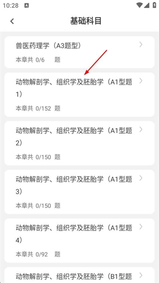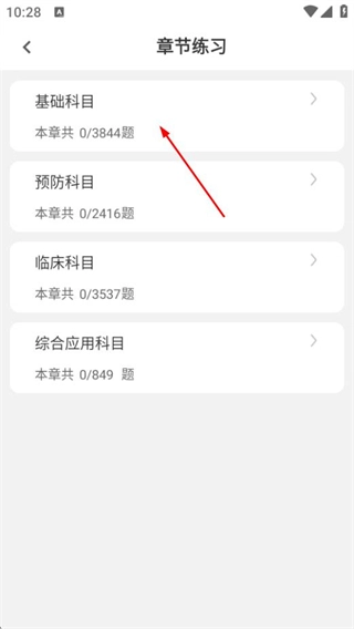在章節(jié)練習頁面挑選基礎科目這一選項,就能進入到基礎科目題目列表頁面。