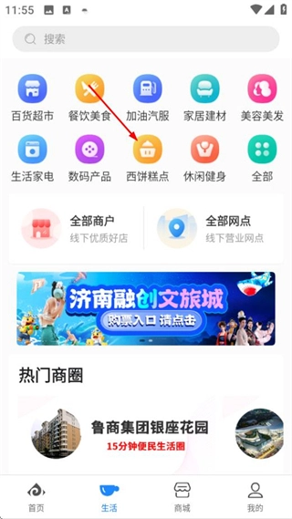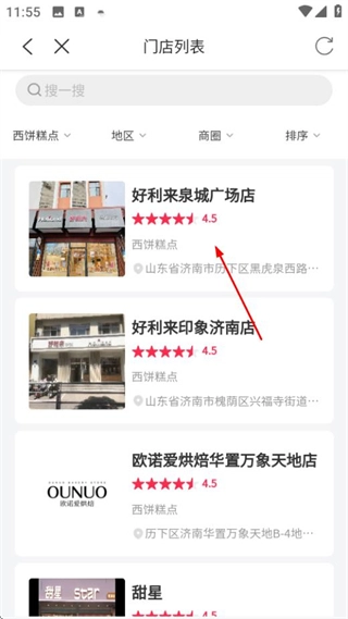在山東一卡通首頁選擇西餅糕點分類,即可進入相關門店的列表頁面。
