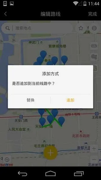 5、 選好路線會彈出提示,是替換還是追加(替換是將現有路線替換成所選擇的常用路線,追加是將所選擇的常用路線追加到現有路線),選擇后點擊完成即可。
