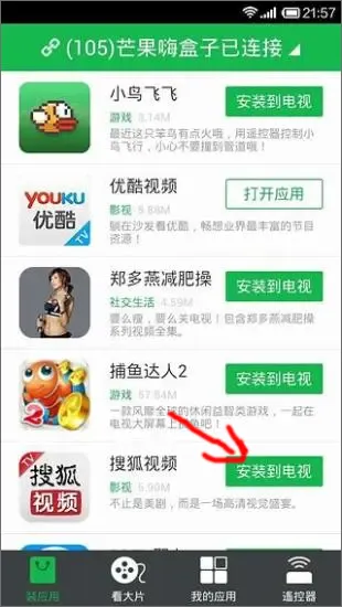 2、借助手機一鍵操作即可為電視安裝應用,使電視切實實現智能化。