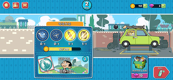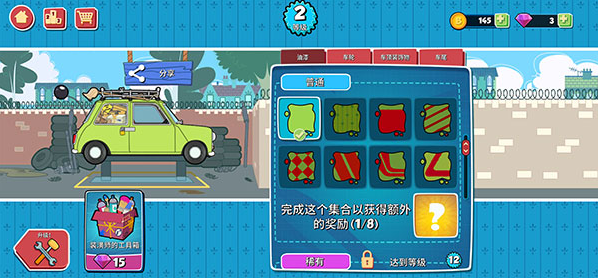 1、用油漆、車輪、車頂裝飾和車尾部件升級他那輛綠色的古董車。把這些配件都收集齊全就能拿到特別獎勵!
