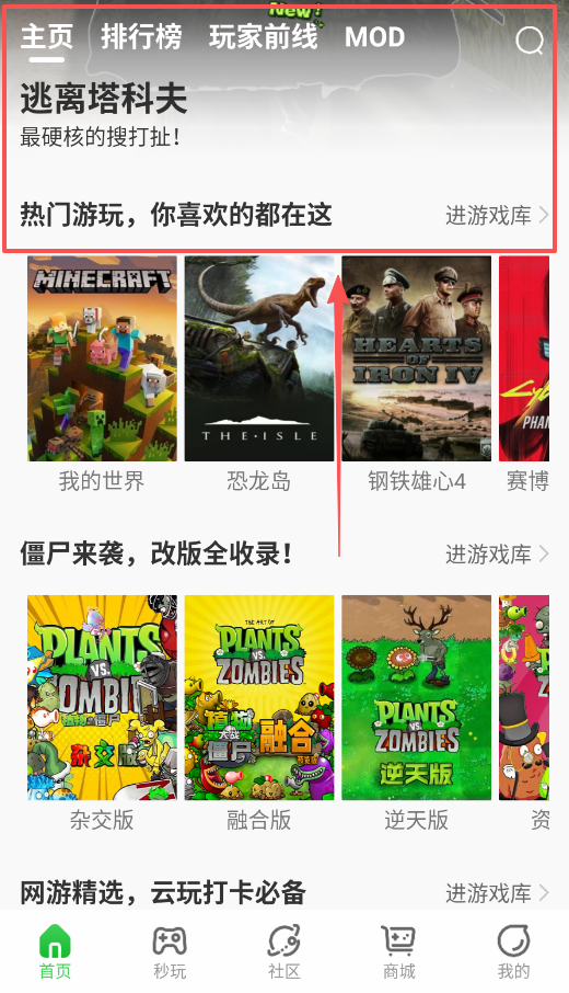 3、主頁上的“熱門游玩”“僵尸來襲”等分類板塊,整合了當(dāng)下最受追捧的游戲內(nèi)容,要是你正糾結(jié)不知道玩什么,來這里尋覓靈感絕對(duì)靠譜。